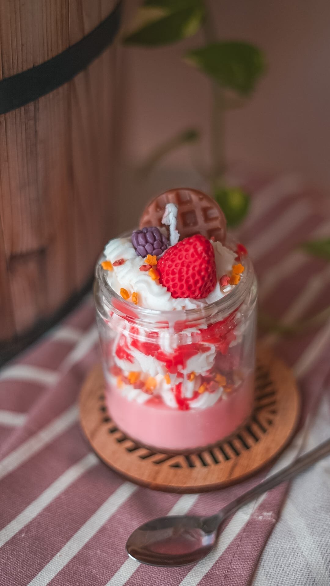 Ca un desert roz desprins dintr-o zi senină. Lumânarea „Șerbet de Căpșune” e o joacă de straturi: biscuiți, frișcă pufoasă și căpșuni dulci, toate transformate într-o mică poveste parfumată.